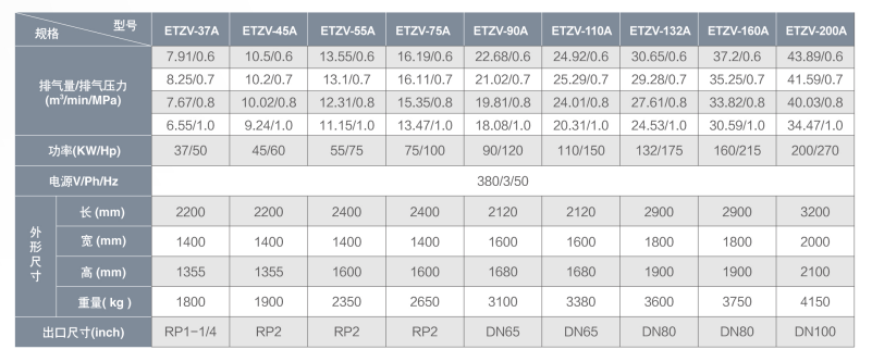 The typical set temperature is 81°C, ensuring optimal lubrication performance while preventing sudden shutdowns caused by high temperatures.XZV- series technical parameters: Model 10A 15A 20A 25A 30A 40A X50A 60A 75A Free air delivery/Discharge air pressure (M3/min/ Mpa) 1.1/0.7 1.65/0.7 2.5/0.7 3.0/0.7 3.7/0.7 5.0/0.7 6.5/0.7 8.0/0.7 10.8/0.7 1.0/0.8 1.5/0.8 2.3/0.8 2.9/0.8 3.5/0.8 4.8/0.8 6.2/0.8 7.5/0.8 10.2/0.8 0.9/1.0 1.53/1.0 2.1/1.0 2.7/1.0 3.1/1.0 4.3/1.0 5.6/1.0 6.8/1.0 9.0/1.0 0.8/1.25 1.1/1.25 1.7/1.25 2.4/1.25 2.7/1.25 4.0/1.25 5.0/1.25 5.6/1.25 7.6/1.25 Air supply temperature ≤ambient temperature +8~`15ºC Motor Power (kw/hp) 7.5/10 11/15 15/20 18.5/25 22/30 30/40 37/50 45/60 55/75 Start method Y-△Starter Voltage (v/hz) 380V 3PH 50HZ (380V-3PH-60HZ/ 460V- 3PH- 60HZ/ 220V- 3PH-60HZ/ 400V-3PH-50HZ/6000V-3PH-50HZ/other voltagesd customized ) Drive method Direct Drive Oil content (PPM) ≤3 Connector inch 3/4″ 3/4″ 1″ 1″ 1″ 1 1/4″ 1 1/4″ 1 1/2″ 1 1/2″ Noise(Db)±2 66 68 68 68 68 68 72 72 75 Dimension length mm 850 1100 1100 1250 1250 1250 1350 1350 1800 width mm 670 750 750 850 850 850 1000 1000 1230 height mm 870 920 920 1160 1160 1160 1190 1190 1570 Weight (kg) 178 260 267 310 396 450 586 593 1073 Model 100A 120A 150A 175A 200A 250A 300A 350A Free air delivery/Discharge air pressure (M3/min/ Mpa) 13.4/0.7 16.2/0.7 21.0/0.7 24.5/0.7 28.7/0.7 32.0/0.7 36.0/0.7 42.0/0.7 12.6/0.8 15.0/0.8 19.8/0.8 23.2/0.8 27.6/0.8 30.4/0.8 34.3/0.8 40.5/0.8 11.2/1.0 13.8/1.0 17.4/1.0 20.5/1.0 24.6/1.0 27.4/1.0 30.2/1.0 38.2/1.0 10/1.25 12.3/1.25 14.8/1.25 17.4/1.25 21.5/1.25 24.8/1.25 27.7/1.25 34.5/1.25 Air supply temperature ≤ambient temperature +8~`15ºC Motor Power (kw/hp) 75/100 90/120 110/150 132/175 160/200 185/250 220/300 250/350 Start method Y-△Starter Voltage (v/hz) 380V 3PH 50HZ (380V-3PH-60HZ/ 460V- 3PH- 60HZ/ 220V- 3PH-60HZ/ 400V-3PH-50HZ/6000V-3PH-50HZ/other voltagesd customized ) Drive method Direct Drive Oil content (PPM) ≤3 Connector inch 2″ 2″ 2 1/4″ 2 1/2″ 2 1/2″ 2 1/2″ DN100 DN100 Noise(Db)±2 78 85 85 85 88 88 90 90 Dimension length mm 1900 1900 2300 2300 2650 2650 3300 3300 width mm 1230 1230 1470 1470 1650 1650 2100 2100 height mm 1570 1570 1840 1840 2045 2045 2045 2190 Weight (kg) 1171 1327 1801 1848 2400 2600 3100 3300 Advantages: