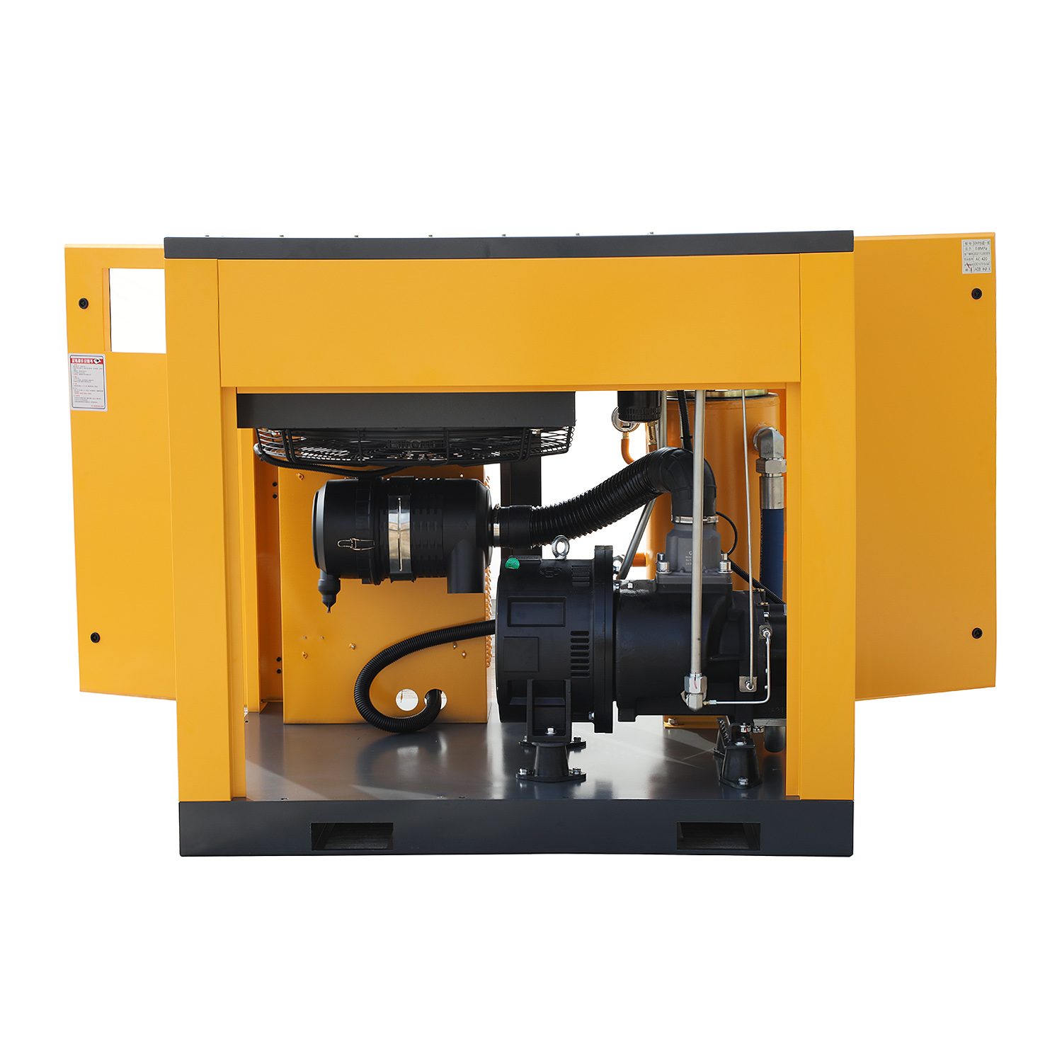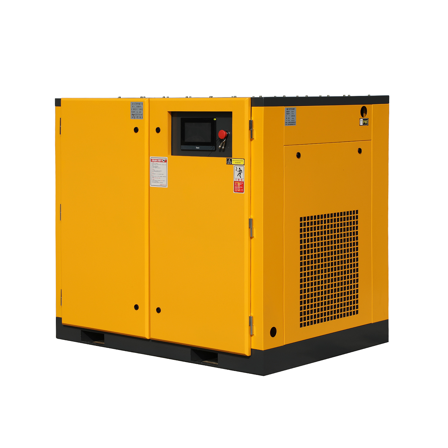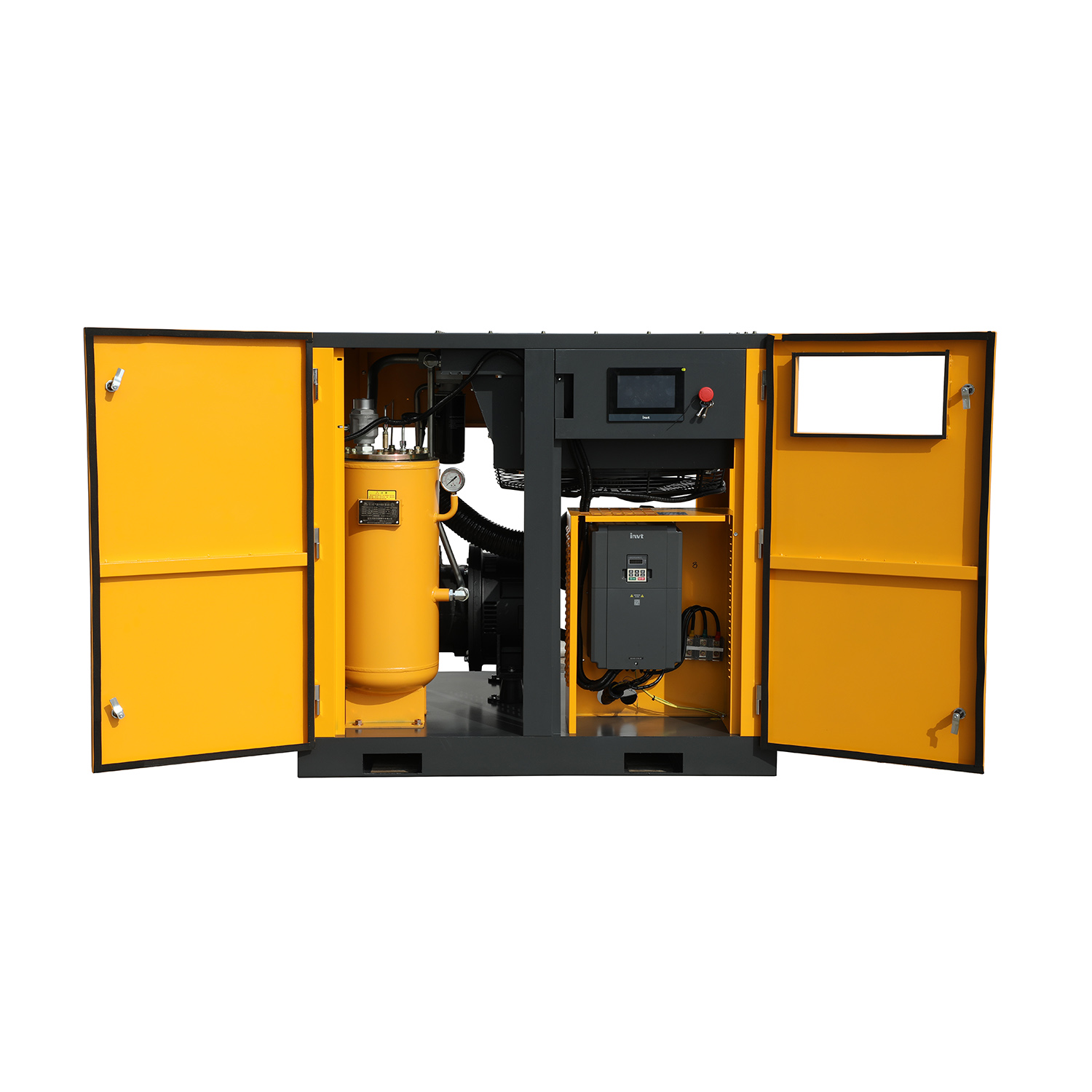 Our 15kW Permanent Magnet Variable Frequency Integrated Screw Air Compressor combines advanced permanent magnet motor technology with a fully integrated variable frequency drive (VFD) system to deliver exceptional energy savings, stable performance, and low maintenance costs. Designed for industrial and commercial applications, this compressor ensures high efficiency, reduced energy consumption, and quiet operation.SpecificationPermanent Magnet Motor (PM Motor) – Offers IE4/IE5 ultra-high efficiency, significantly lowering power consumption compared to traditional induction motors.Integrated Variable Frequency Drive (VFD) – Automatically adjusts motor speed to match air demand, eliminating energy waste from unloading cycles.Low Noise & Vibration – Optimized screw rotor design and soundproof enclosure ensure quiet operation (as low as 65 dB).Compact & Space-Saving Design – Fully integrated unit with built-in cooling system, reducing installation footprint. Smart Control System – User-friendly LCD touchscreen with real-time monitoring, fault alerts, and remote control capability.